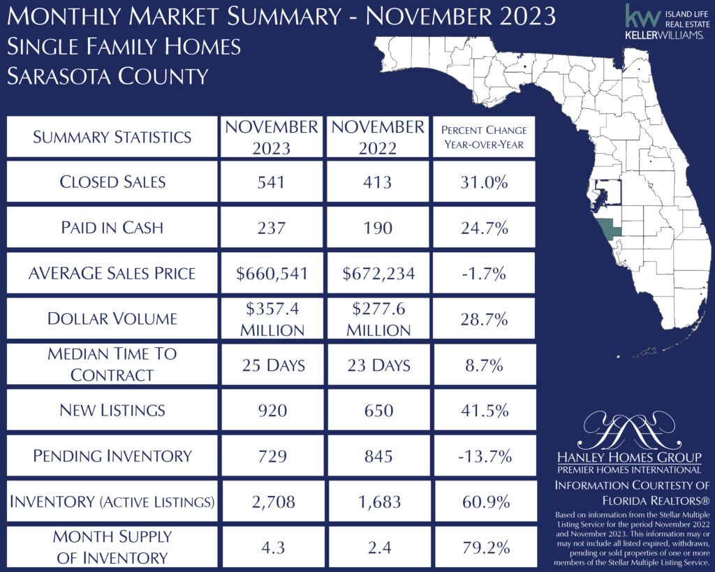 SARASOTA, Fla. (December 20, 2023) – The demand for housing in Sarasota and Manatee counties remains strong despite the higher interest rates and home prices. According to data from Florida REALTORS® and compiled by the REALTOR® Association of Sarasota and Manatee (RASM), November showed a continued rise in the month’s supply of inventory, approaching the levels seen leading up to the pandemic.